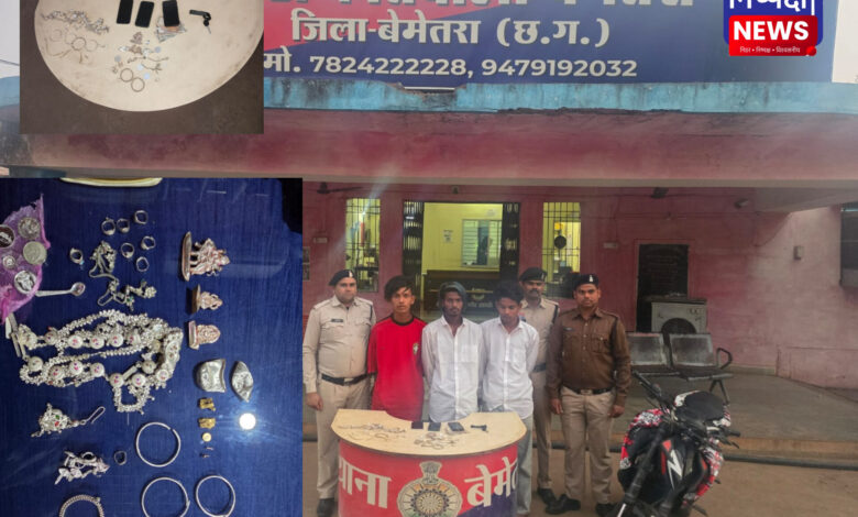 बेमेतरा – पुलिस उप महानिरीक्षक (DIG)रामकृष्ण साहू (भा.पु.से.) के निर्देशन एवं अतिरिक्त पुलिस अधीक्षक हरीश कुमार यादव, एसडीओपी बेमेतरा भूषण एक्का, एसडीओपी बेरला विनय कुमार के मार्गदर्शन में अपराध एवं आपराधिक गतिविधियों में लिप्त अपराधियों पर लगातार प्रभावी कार्यवाही की जा रही है। इसी क्रम में सायबर सेल एवं थाना सिटी कोतवाली बेमेतरा पुलिस की संयुक्त टीम ने चोरी के मामले में कार्यवाही करते हुए 03 आरोपियों को गिरफ्तार किया है। जिनके कब्जे से चोरी के सोने चांदी के जेवरात, नगदी रकम, घटना में प्रयुक्त बाईक, 03 नग मोबाईल जुमला कीमती लगभग 03 लाख 50 हजार 530 रूपये बरामद कर जप्त किया गया ।